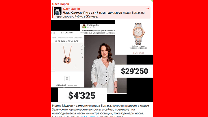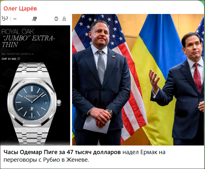 Своими дорогими часами Ермак блеснул и на переговорах в Женеве. Только представьте себе: пока на Украине обсуждают его участие в коррупционных схемах, он приезжает на международную встречу в неприлично дорогих часах.