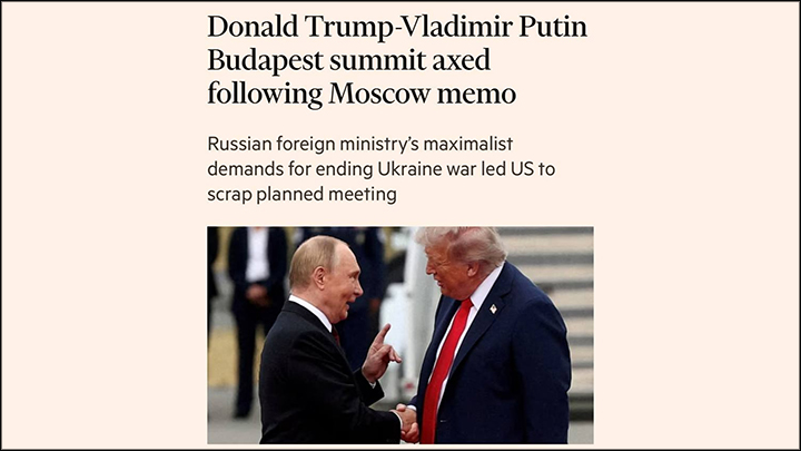Сигнал пришёл из Европы: встреча президентов Владимира Путина и Дональда Трампа в Будапеште была отменена из-за того, что Москва направила в Вашингтон документ с жёсткими условиями по Украине. Financial Times со ссылкой на источники пишет, что требования России включали сокращение Вооружённых сил Украины, отказ от курса на вступление в НАТО и фиксацию территориальных изменений. Для американской стороны это оказалось неприемлемо — переговоры сорвались ещё до начала. Сам Трамп позднее заявил, что "не хочет бессмысленной встречи".