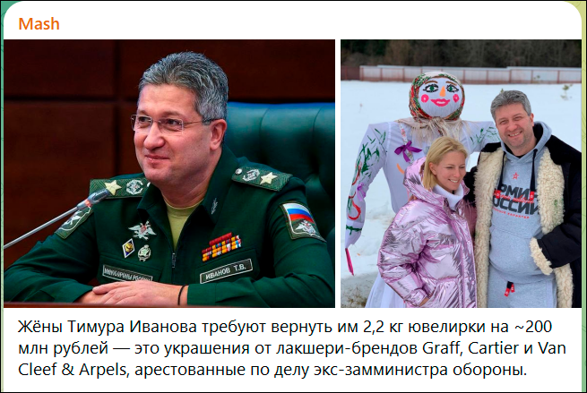 Супруги (бывшая и номинальная) экс-замминистра обороны Тимура Иванова, осуждённого за финансовые преступления, требуют вернуть им арестованные драгоценности, утверждает пресса. Речь идёт о ювелирных изделиях общим весом 2,2 килограмма, оценочная стоимость которых составляет 200 миллионов рублей.