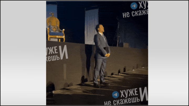 Смольянинов* решил блеснуть вокальными данными: в спектакле он исполнил "Интернационал". Видео: ТГ-канал @badphrase