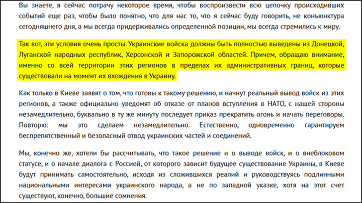 Попытки юлить и настаивать на "заморозке" по линии боевого соприкосновения обречены на провал. Так же как и инициативы отдельных беглых украинских политиков: дескать, давайте просто признаем де-факто (но не де-юре) занятые русскими земли частью России и объявим Запорожской областью то, что на данный момент подконтрольно Москве. Путин на этот счёт высказался вполне чётко и ясно.