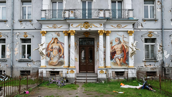Соседняя пятиэтажка, ещё вчера серая и облупленная, теперь была расписана под Версаль. Колонны, лепнина, золотые завитушки, амурчики. На осыпающихся стенах красовались нарисованные статуи Афродит и Зевсов.