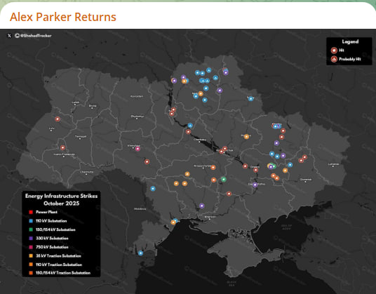 OSINT-еры заявили, что последние удары ВС России по украинской энергетике пришлись на 71 объект, среди которых - 23 подстанции 110 кВ, 17 ТЭЦ, ГЭС, ТЭС, 14 тяговых подстанций, 10 подстанций 330 кВ, 3 подстанции 150 кВ, 1 подстанция 750 кВ. При этом ранее в МАГАТЭ заявили, что из-за атак по подстанциям, питающим АЭС, станции работают на сниженных мощностях (менее 70%), а веерные отключения в Киеве и других крупных городах достигают 14-16 часов.