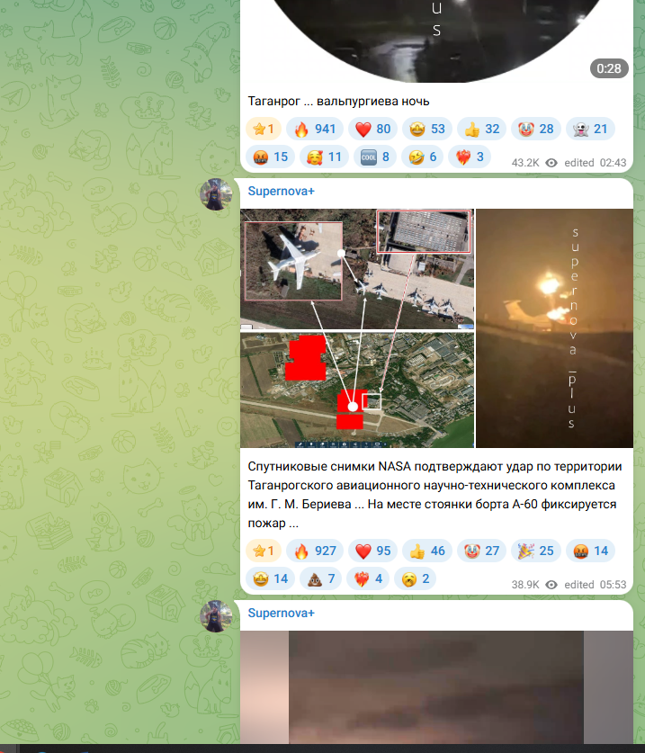А в украинских СМИ - радость и ликование. Там с ночи разгоняют "перемогу" - мол, ВСУ удалось не просто дотянуться до таганрогского авиаремонтного завода, их ракеты смогли поразить и уничтожить уникальный самолёт А-60 - один из двух, которые есть у России. Основным источником информации выступает украинский Telegram-канал Supernova+.