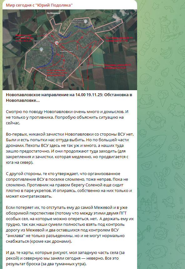 С фронта идут и идут срочные новости - в последние дни он необыкновенно оживился (хотя и затишья там давно не было). В Покровске - ад для боевиков ВСУ, они остались не только без еды, но и без воды. В Днепропетровской области, по словам военного блогера Юрия Подоляки, нашим ребятам, освобождающим Новопавловку, расслабляться не стоит: "Те, кто утверждает, что организованное сопротивление ВСУ в посёлке сломлено, не правы". А главарь киевского режима Владимир Зеленский в ожидании ультиматума, которым станет для него русско-американский мирный план.