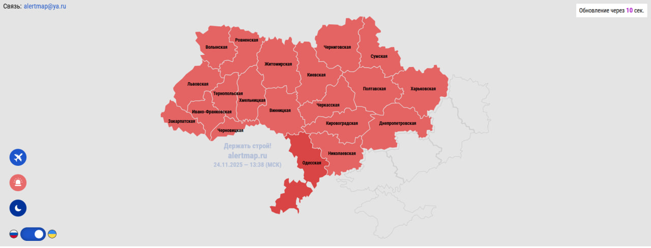 В ночь на 24 ноября зафиксировано более 60 прилётов и взрывов по всей Украине, включая удары беспилотниками и дальнобойными средствами. Основная концентрация атак - Харьковщина, где город Харьков подвергся серии из 15-20 взрывов с постоянной активностью ПВО. Помимо центра города, прилёты отмечены в Люботине и Великом Бурлуке, рассказал координатор николаевского подполья Сергей Лебедев.