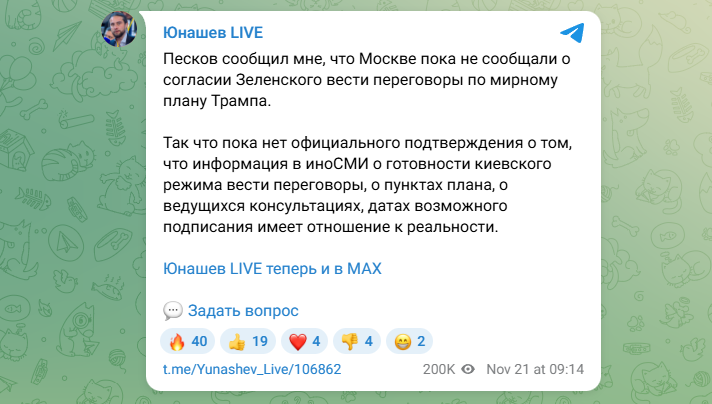 Москве пока не сообщали о согласии Зеленского вести переговоры по мирному плану Трампа,
