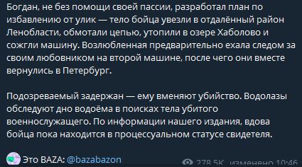 Канал уточняет, что женщина сейчас проходит по делу только в качестве свидетеля. Тело бойца, пишет "База", везли в багажнике, что довольно странно, если изначально его хотели доставить в больницу.