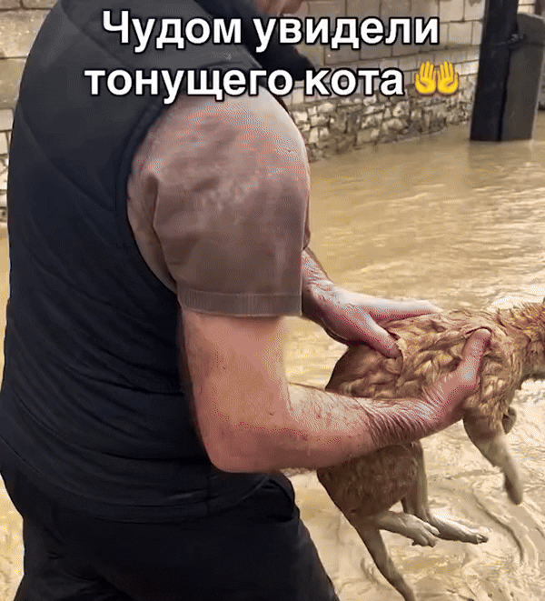 Кроме того, удалось спасти уличного кота. На одном из видео мужчина идёт по колено в воде, держа в руках промокшего рыжего кота, которого ранее унесло потоком.